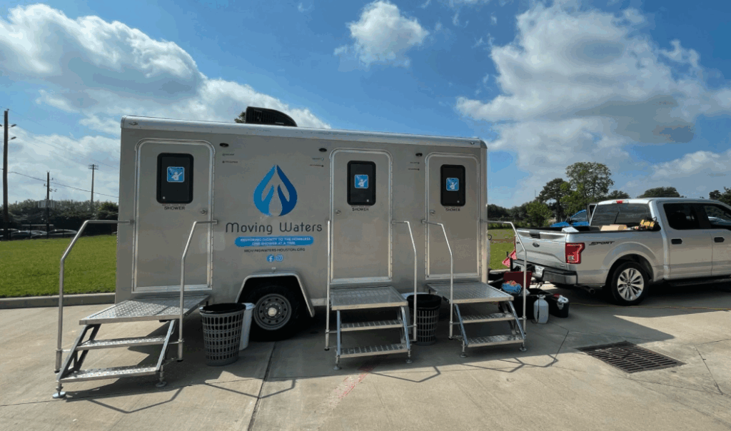 DumpStor of Columbus is proud to work with Moving Waters for the fourth quarter DumpStor Delivers Project of 2024!  A portion of every dumpster rented through the DumpStor franchise network, as well as the DumpStor corporate locations will go directly to the Moving Waters organization. Their organization is “committed to improving the quality of life in our unhoused brothers and sisters in the Galveston and Houston area by providing showers via a mobile shower service.”